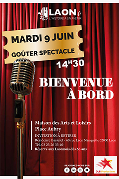 La Direction des Services Solidaires de Laon organise un goûter spectacle "Bienvenue à bord", destiné aux Laonnois dès 65 ans le jeudi 9 juin à partir de 14h30 à la Maison des Arts et Loisirs.
