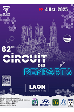 Le Circuit des Remparts est de retour le samedi 4 octobre pour sa 62ème edition.   Au programme de cette course orgbnaisé par la FCLaon Ahlétisme : 15h50 : 1000m Poussin(es) 16h15 : 1000m Benjamin(es)et Minimes 16h45 : 5km 16h50 : 5km (Marche) 18h00 : 10km panoramique.   ...