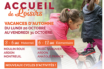 Accueil de Loisirs des vacances d'automne.... Inscriptions à partir du 6 octobre 2025 Du 20 au 31 octobre 2025, 3 sites accueilleront les enfants de 3 à 12 ans et leurs proposeront de faire le plein d'activités ludiques, manuelles et sport...