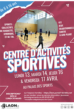 Un Centre d'Activités Sportives accueillera les 6/16 ans les 20, 21, 23 et 24 octobre 2025. Les activités sont assurées en partenariat avec les associations sportives Laonnoises. Inscriptions ...