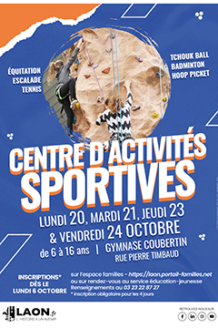 Centre d'activités sportives Un Centre d'Activités Sportives accueillera les 6/16 ans les 20, 21, 23 et 24 octobre 2025. Les activités sont assurées en partenariat avec les associations sportives Laonnoises. Inscriptions dès le 6 octobre 2025: à la Mairie Annexe - Service Éducation Jeunesse (03 23 22 87 27). sur le portail : https://laon.portail-familles.app